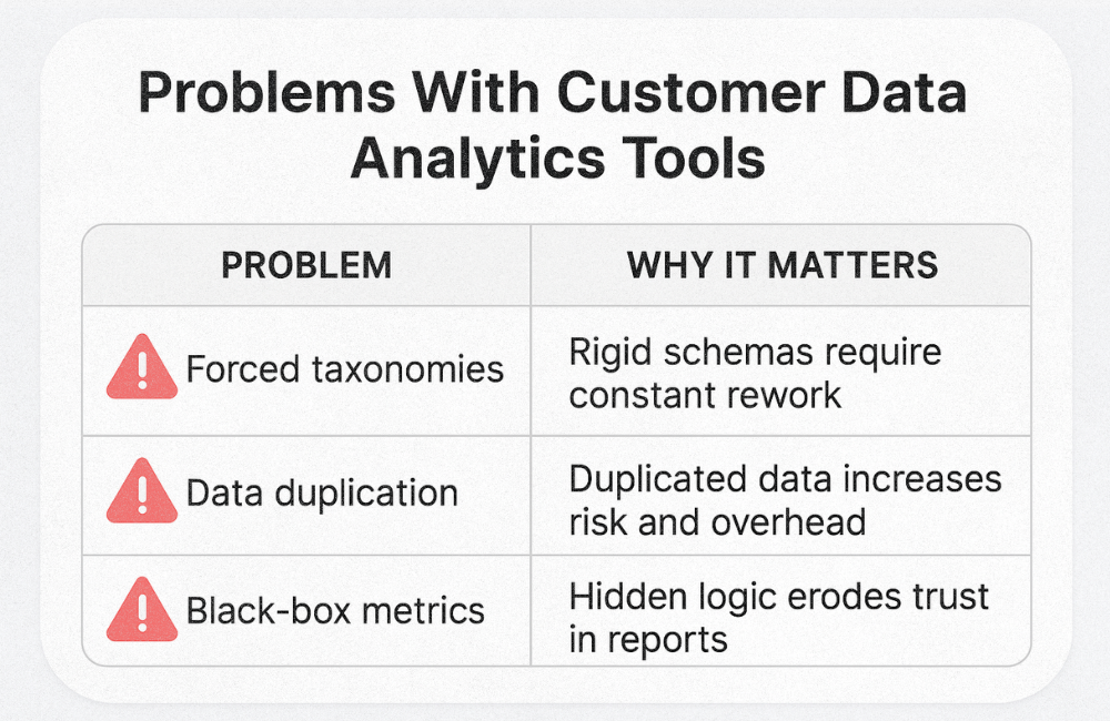 If you’ve ever spent weeks trying to make your data fit a rigid analytics platform, you’re not alone. Many enterprise customer data analytics tools are built around outdated assumptions that make it harder to get insights from your data.